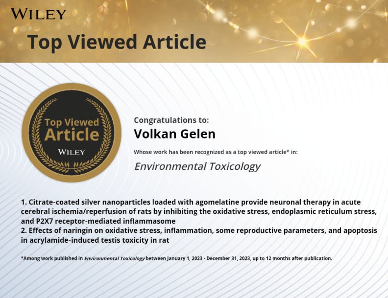 Fakültemiz Fizyoloji ABD öğretim üyesi Doç. Dr. Volkan GELEN 'in WILEY yayın evinde ve Q1 kategorisinde olan ''Environmental Toxicology'' isimli dergide sorumlu yazar olduğu ''Effects of naringin on oxidative stress, inflammation, some reproductive parameters, and apoptosis in acrylamide-induced testis toxicity in rat'' isimli çalışması 2023 yılında yayınlanan yayınlar arasında en çok okunan yayın olmuştur.Hocamızı tebrik eder başarılarının devamını dileriz.